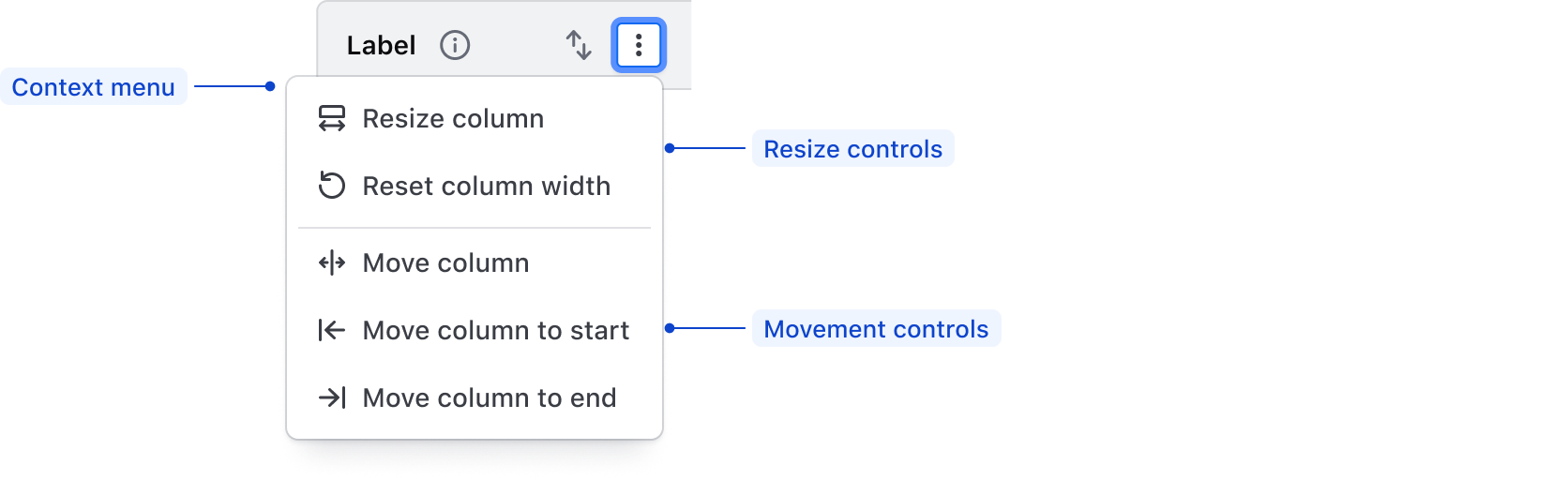 When resizable columns are enabled, actions related to each function are rendered in a context menu in the table header. These functions are not customizable.