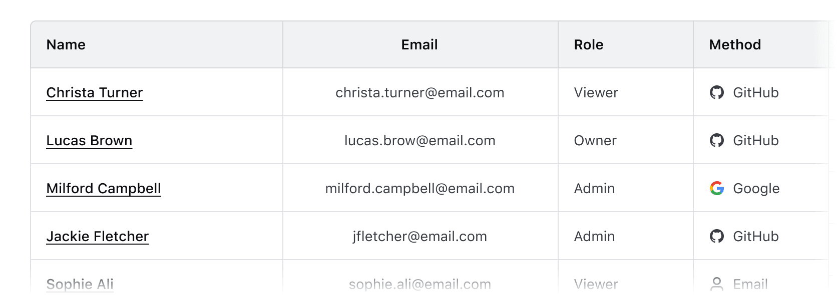 Column width is determined by manually resizing the header column and cells within Figma. As a best practice, column width should be adjusted to fit the longest data type within the cell.